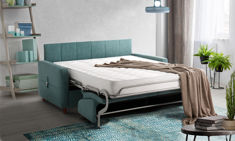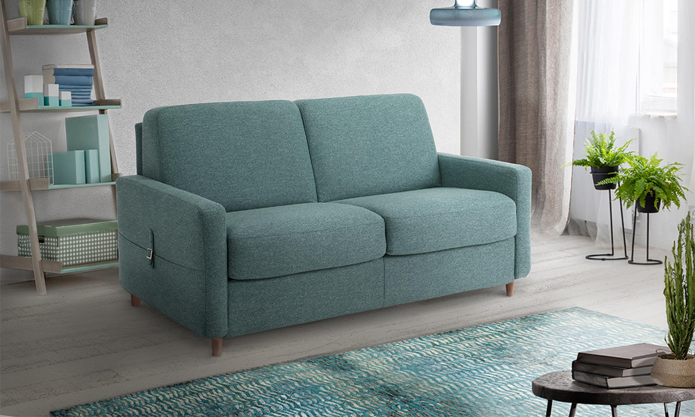 Structure hêtre massif, panneaux de bois stratifié et particules, revêtus de mousse polyéther. Assise mousse polyuréthane expansé 30 kg/m3, coussins amovibles, déhoussables et indéformables. Dossier structure métallique et mousse polyuréthane. Accoudoirs amovibles maintenus par glissières métalliques, 3 dimensions au choix. Tissu nettoyable à sec ou à l’eau. Partiellement déhoussable. Matelas H.17 cm mousse polyuréthane 25 kg/m3. Plateau polyester. Finition galon et fil haute résistance. Sommier grille métallique électrosoudé, basculement automatique, sangles élastiques croisées. Mécanique 2 plis, ouverture par renversement du dossier.