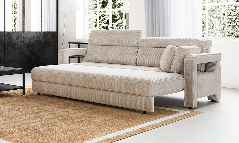 Structure hêtre massif, panneaux de particules renforcée par panneaux de MDF. Canapés suspension assise sangles, fauteuils ressorts métallique plats. Garnissage mousse polyuréthane assise HR 35kg/m3. Dossier HR 23kg/m3. Fabriqué en France.