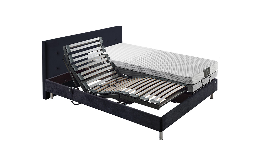 Sommier : Encadrement bois massif latté. Lattes anti-dérapantes multiplis hêtre 7 plis recouvertes film protecteur. Rotules suspendues interactives. Montage par tenons latéraux. Remise à zéro. Option radio fréquence. Garantie 5 ans sommier et moteurs.